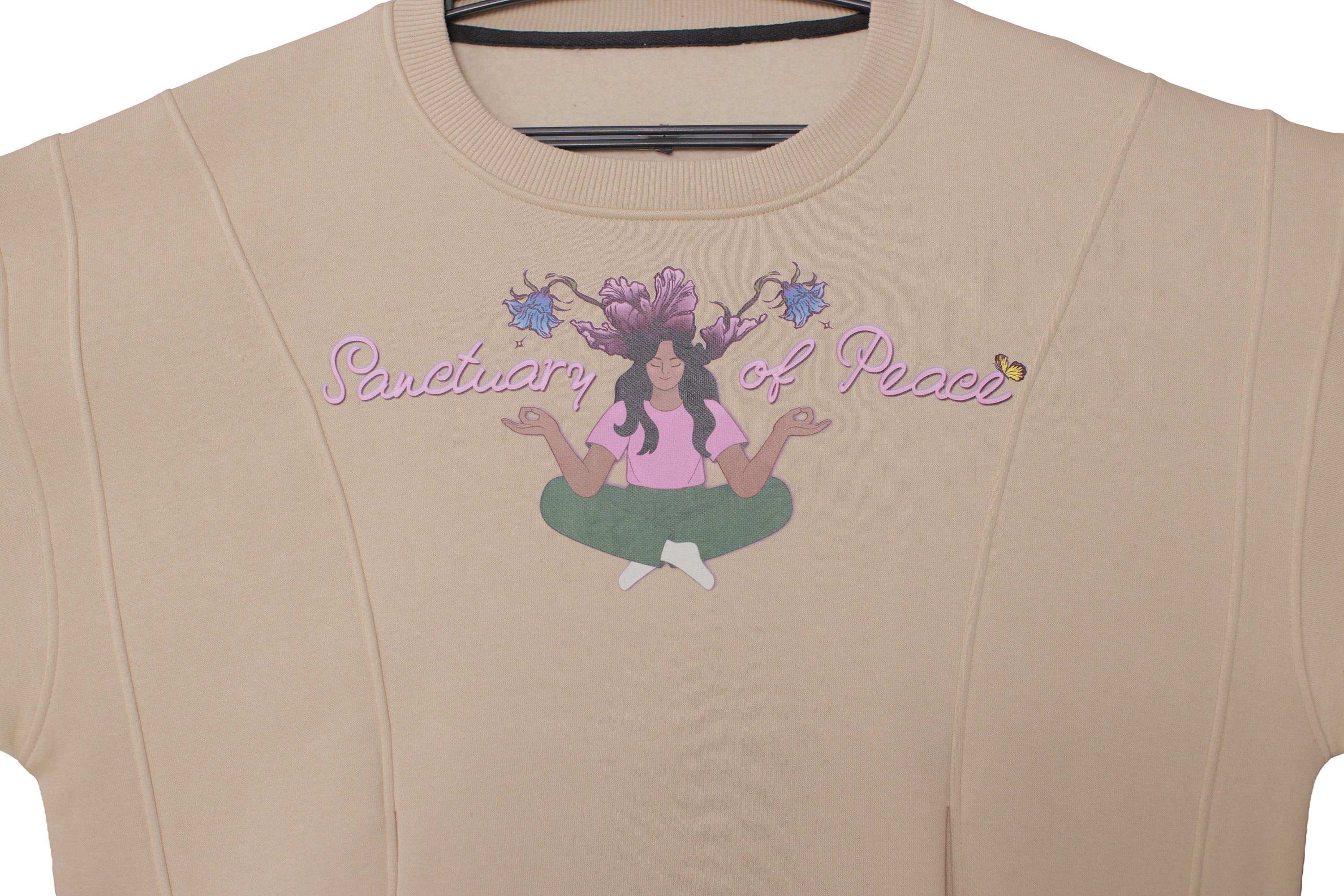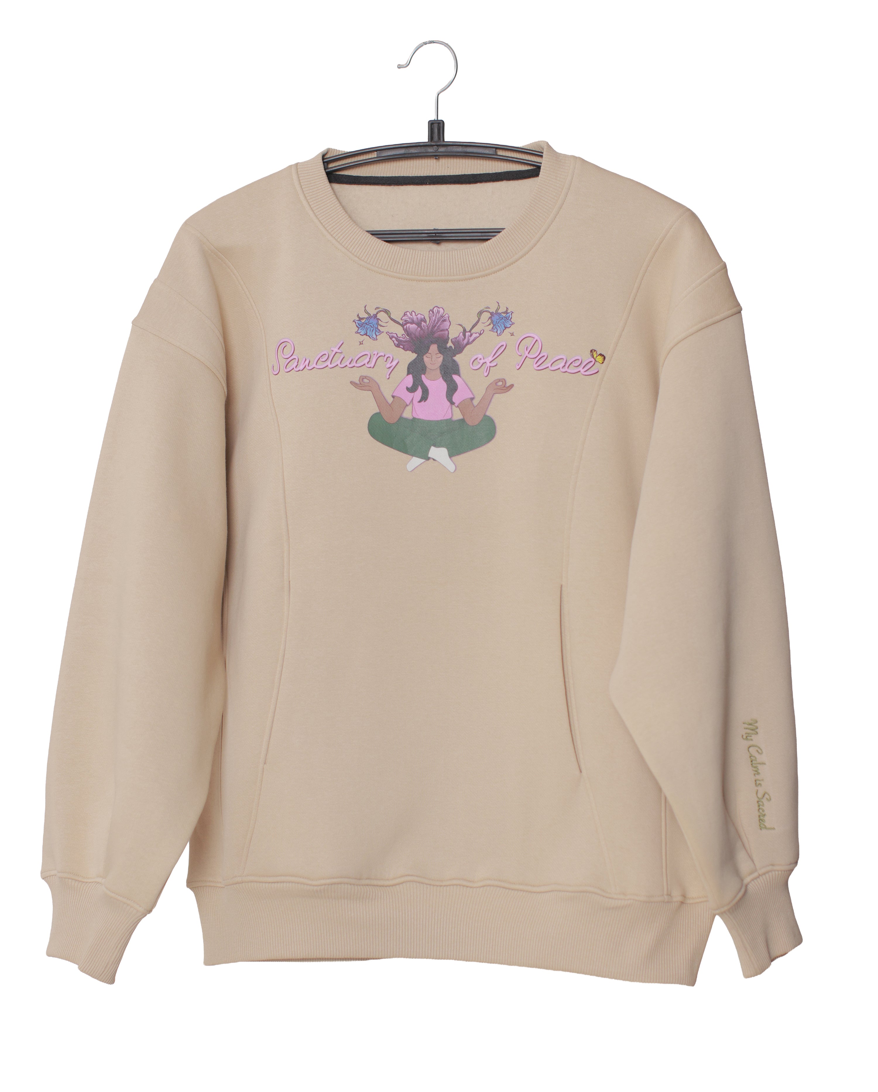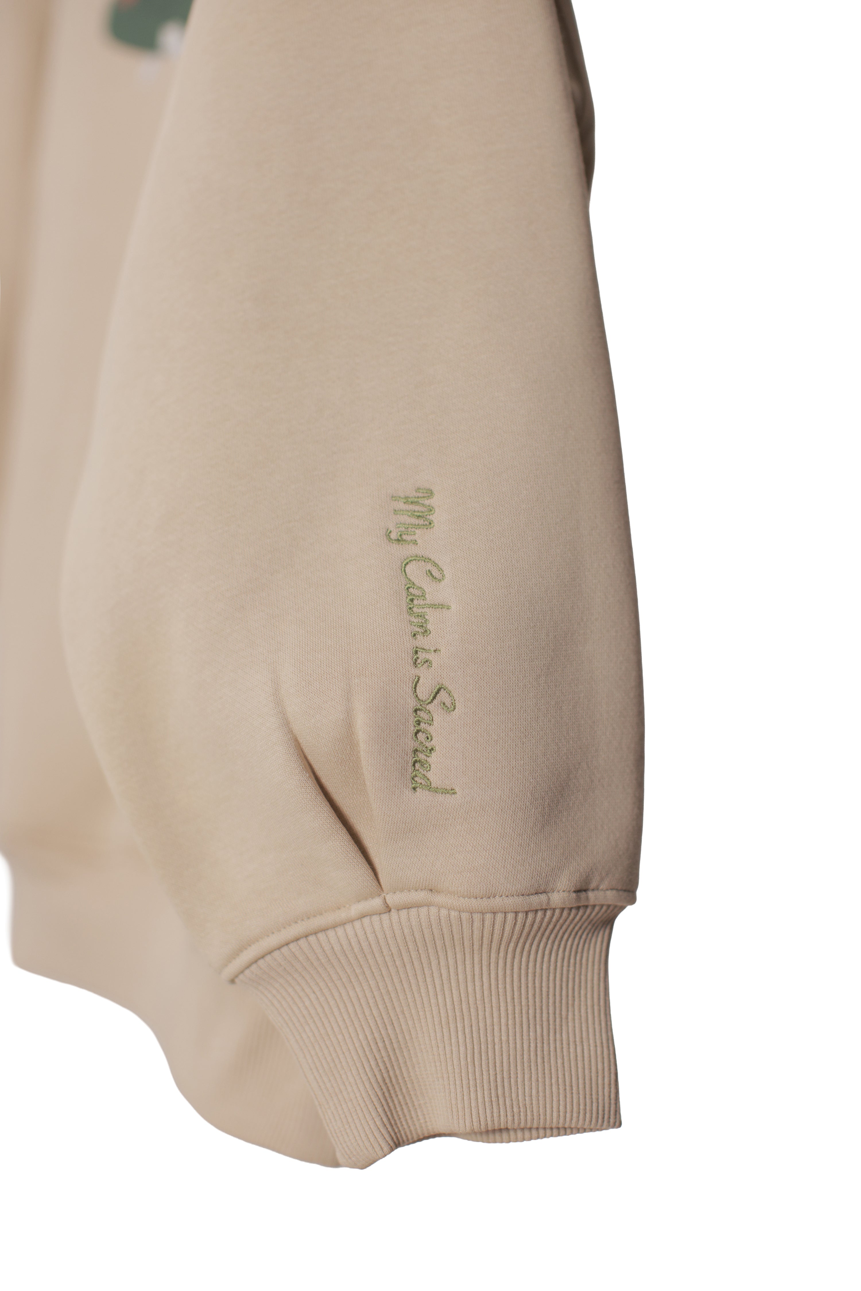 Sleeve quote: “my calm is sacred” (embroidered, left sleeve)