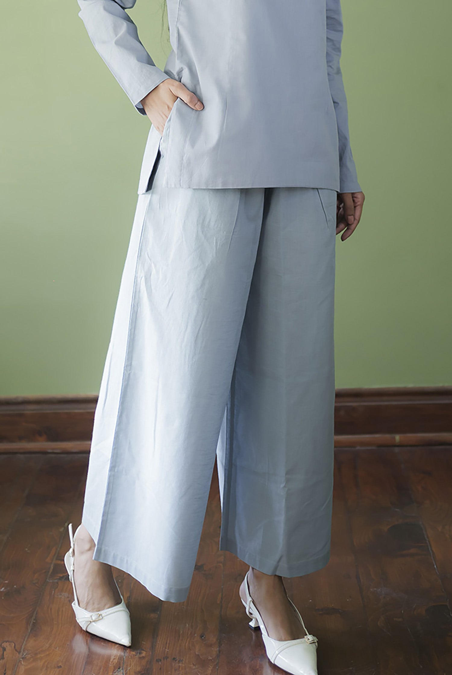 Flat front with side buttoned opening and appropriate pleats for comfort; side seam pockets
