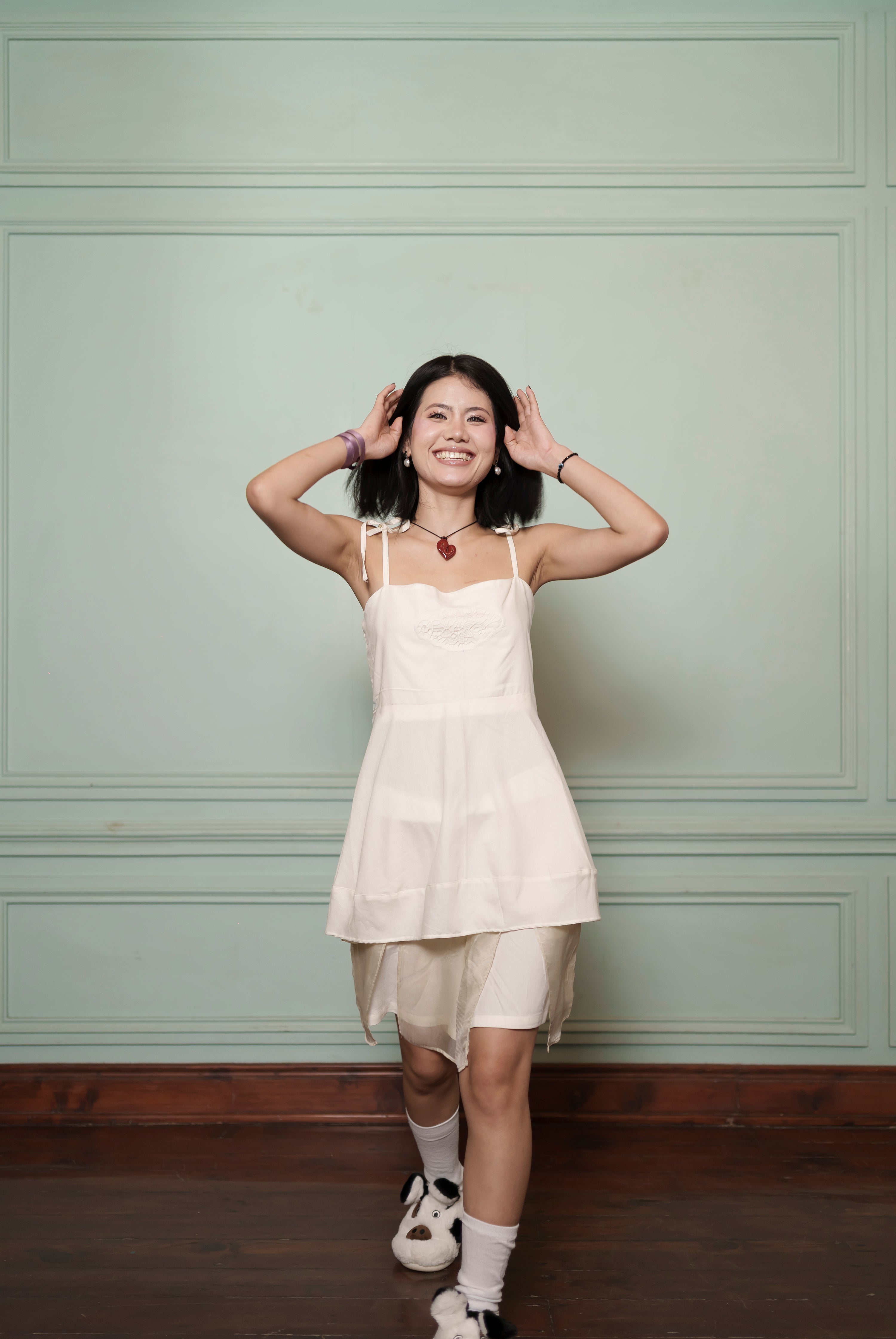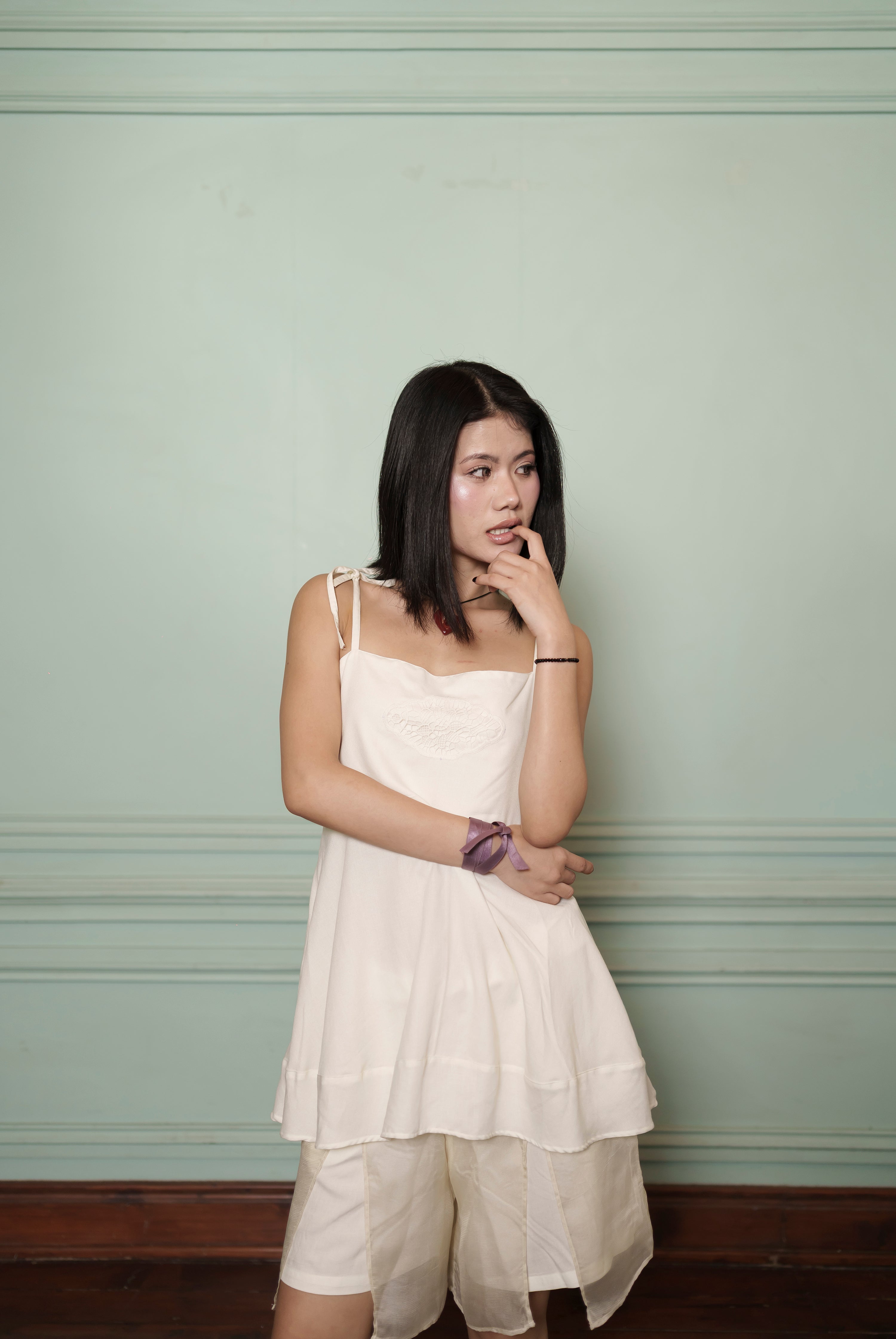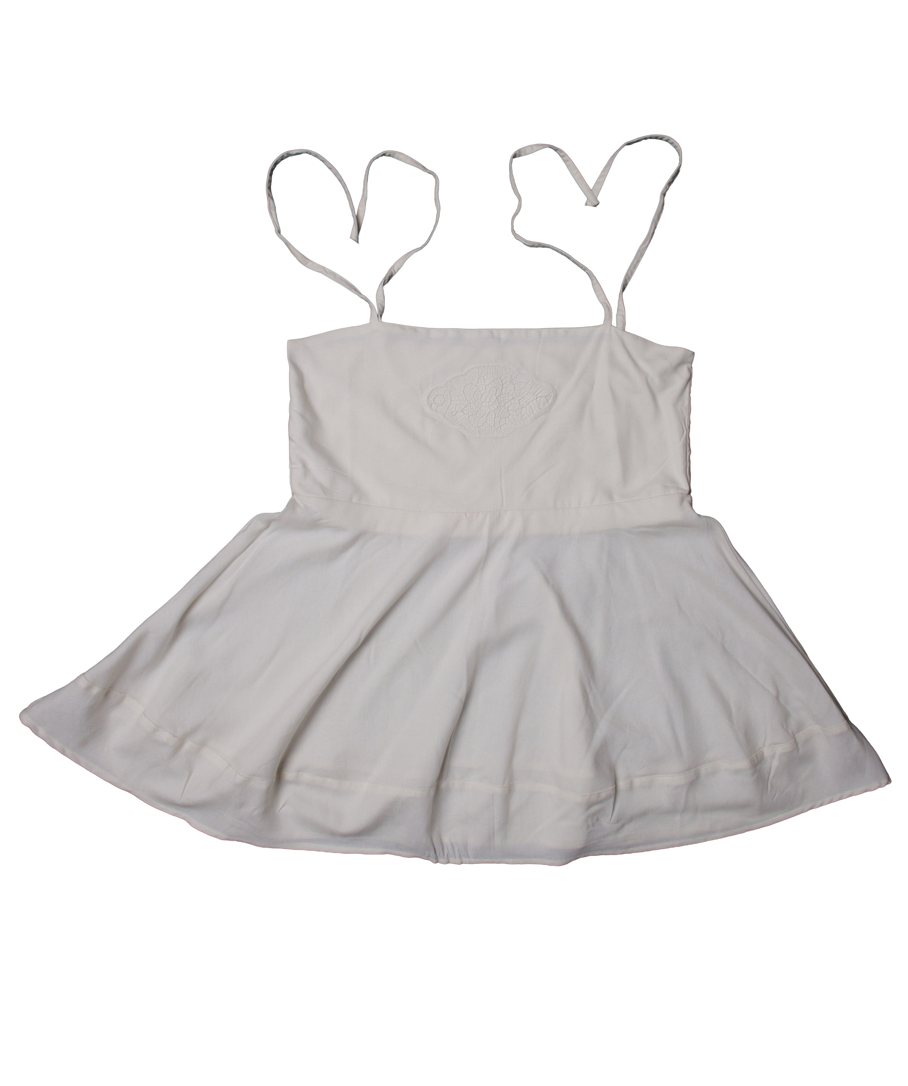Top — Tie-spaghetti straps; softly flared hem; delicate lace medallion at chest