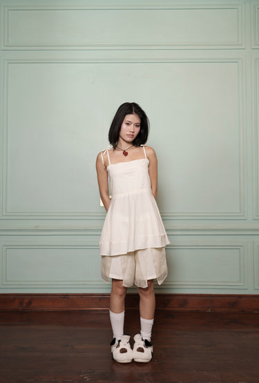 Bottom — Layered shorts; elastic waist; breezy flare