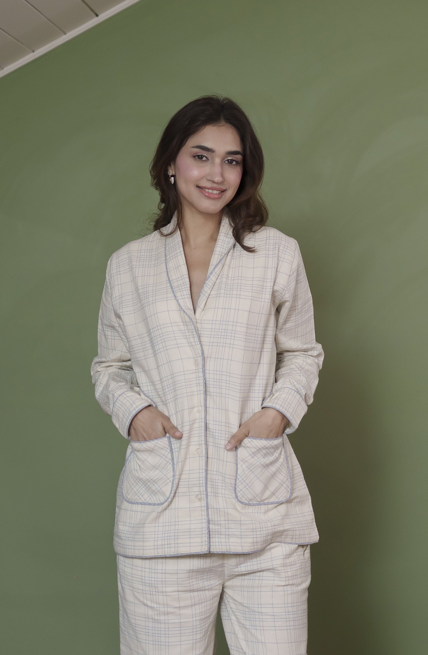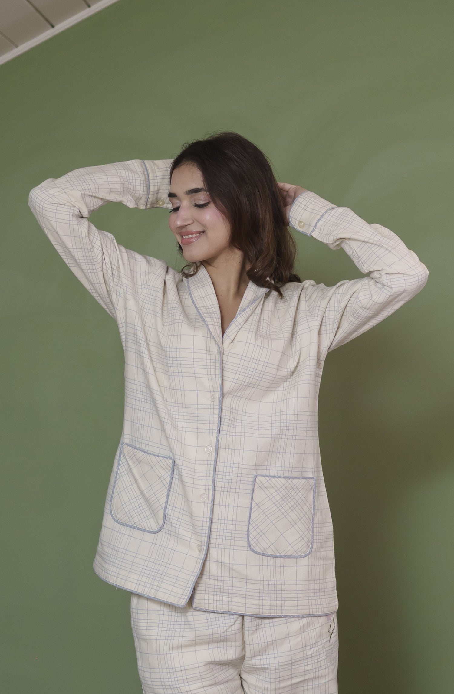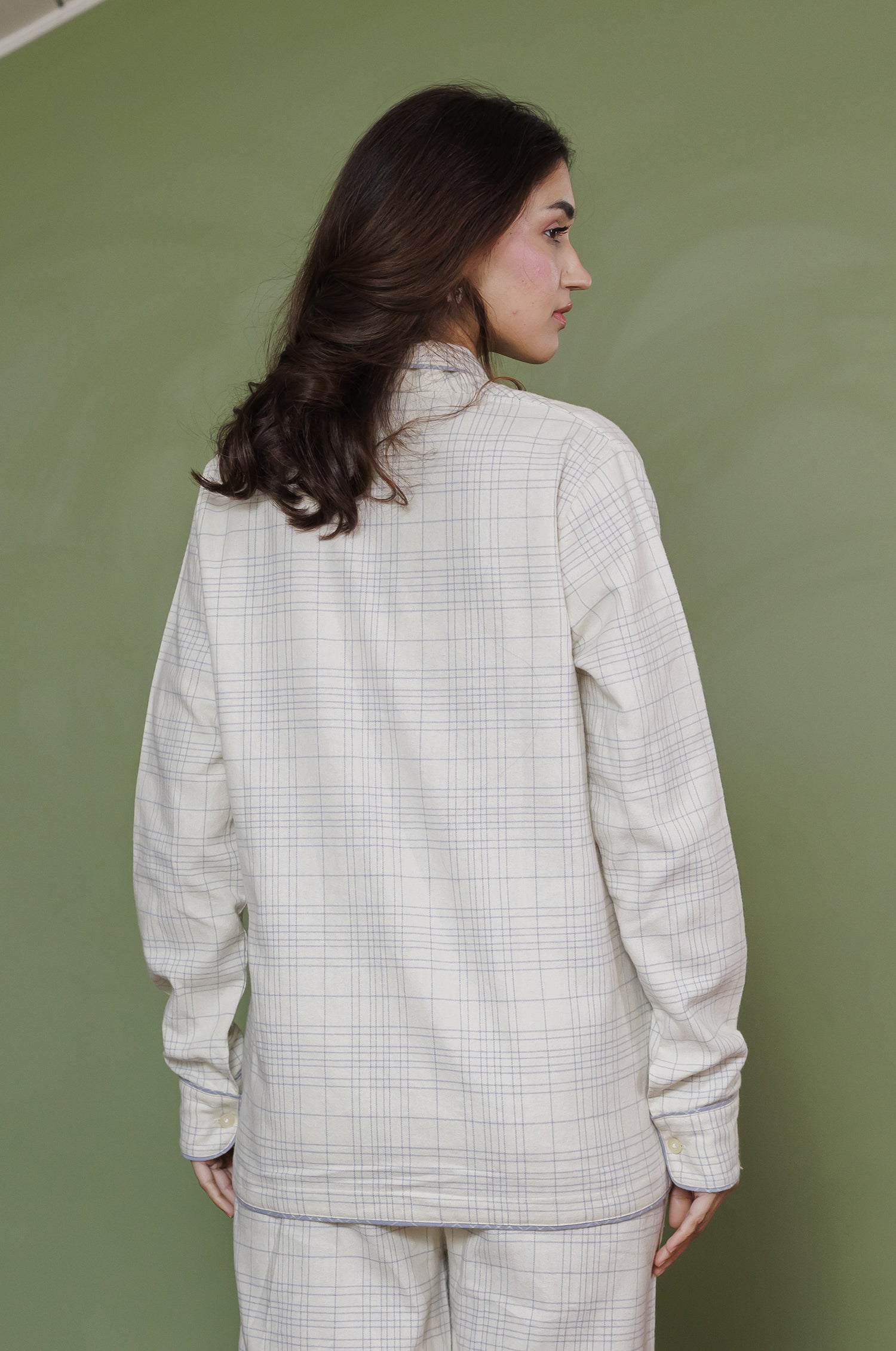 Color : Ivory/soft blue check with light contrast piping