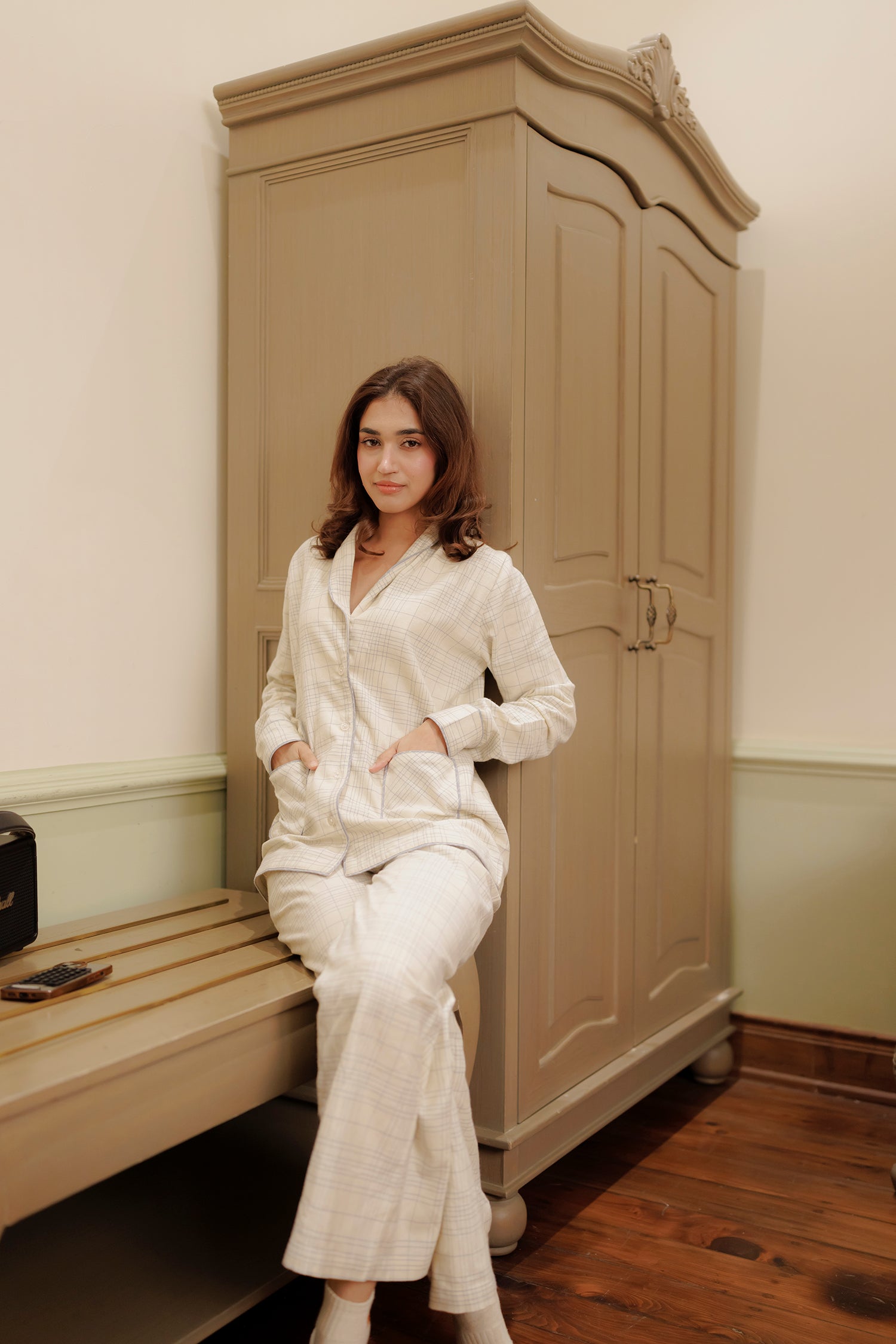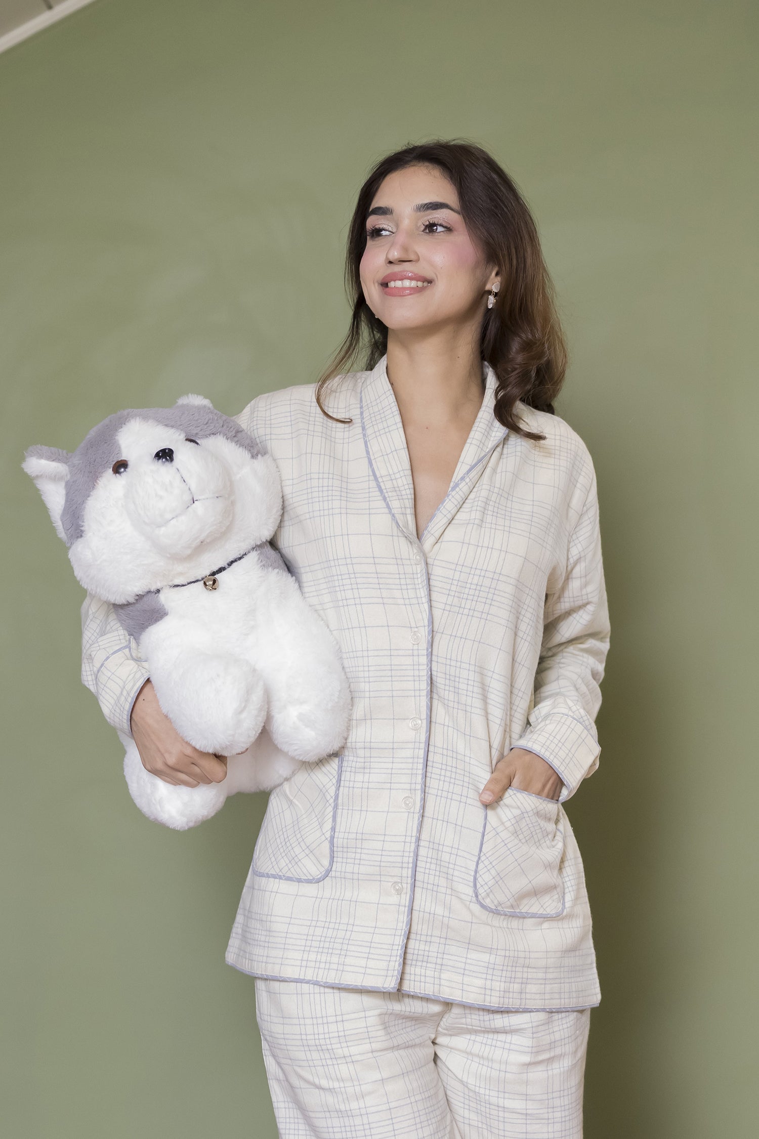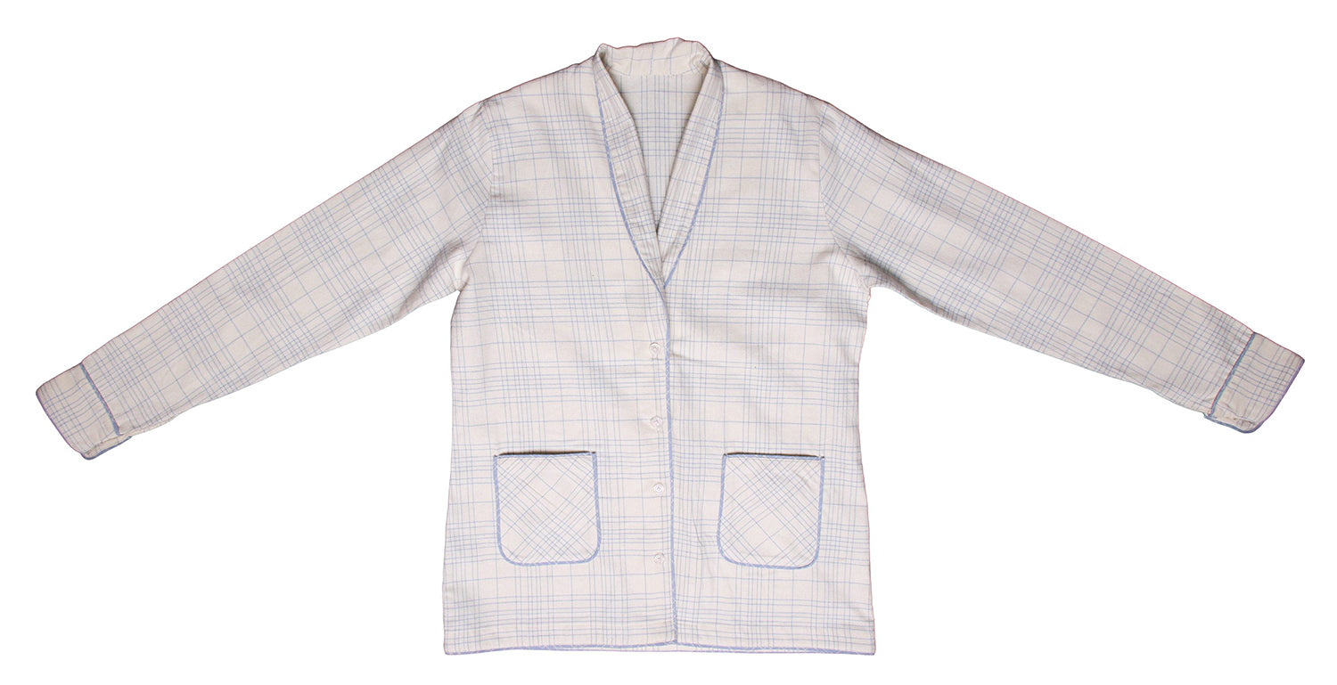 Color : Ivory/soft blue check with light contrast piping