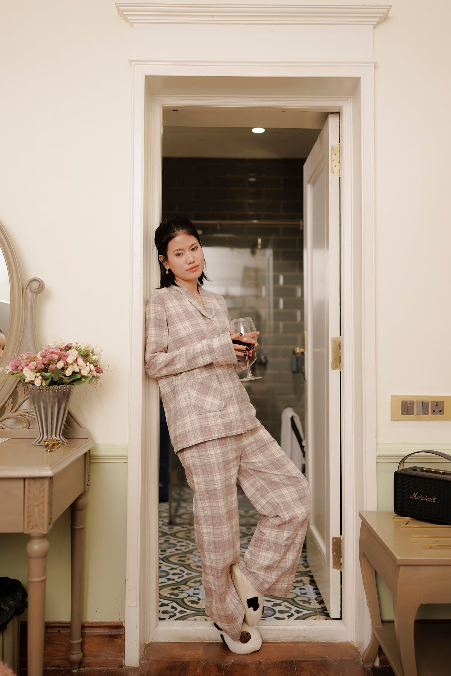 Color : Rose taupe plaid with subtle contrast piping