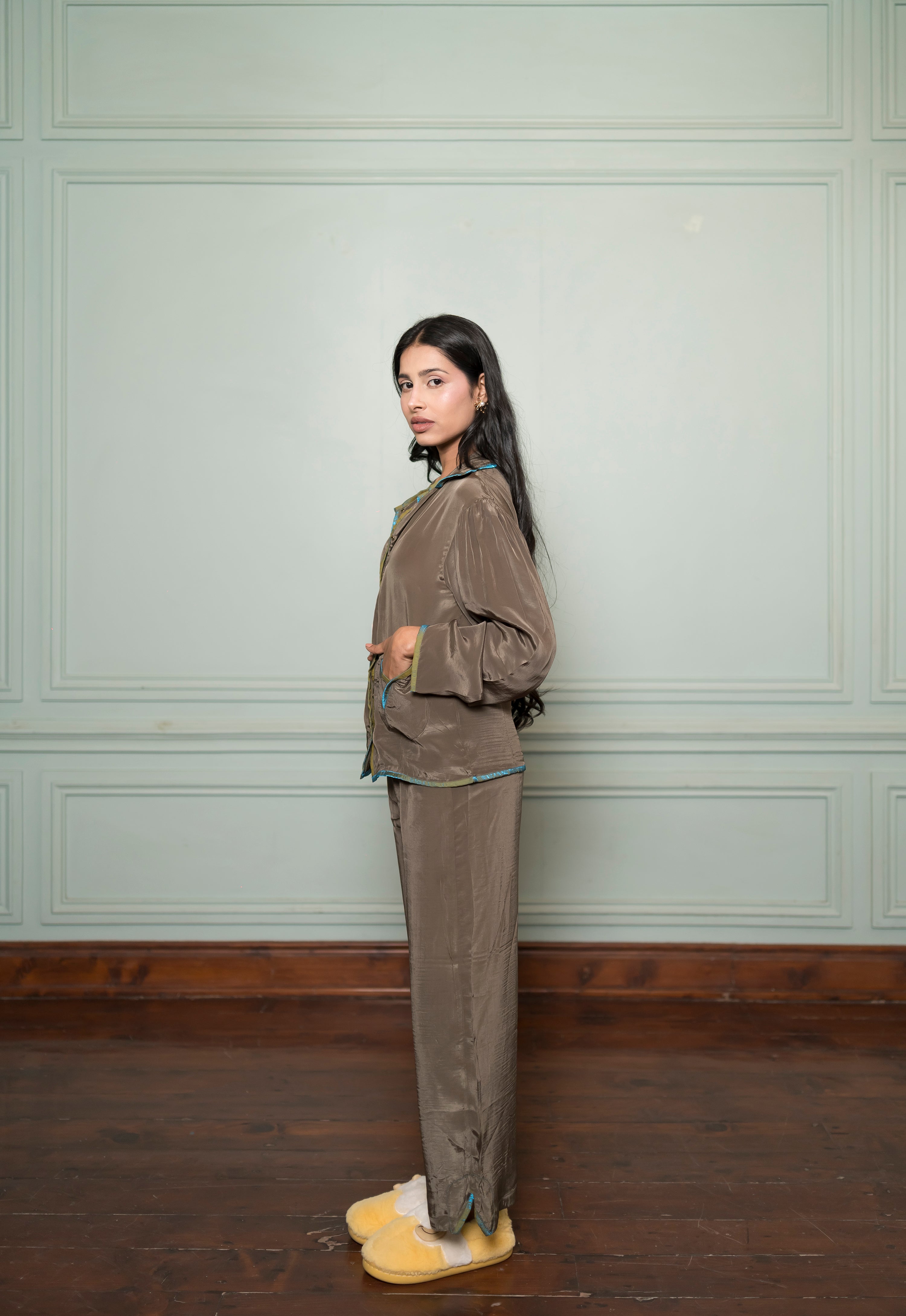Moss Glow Tulip Satin Pyjama Night Suit