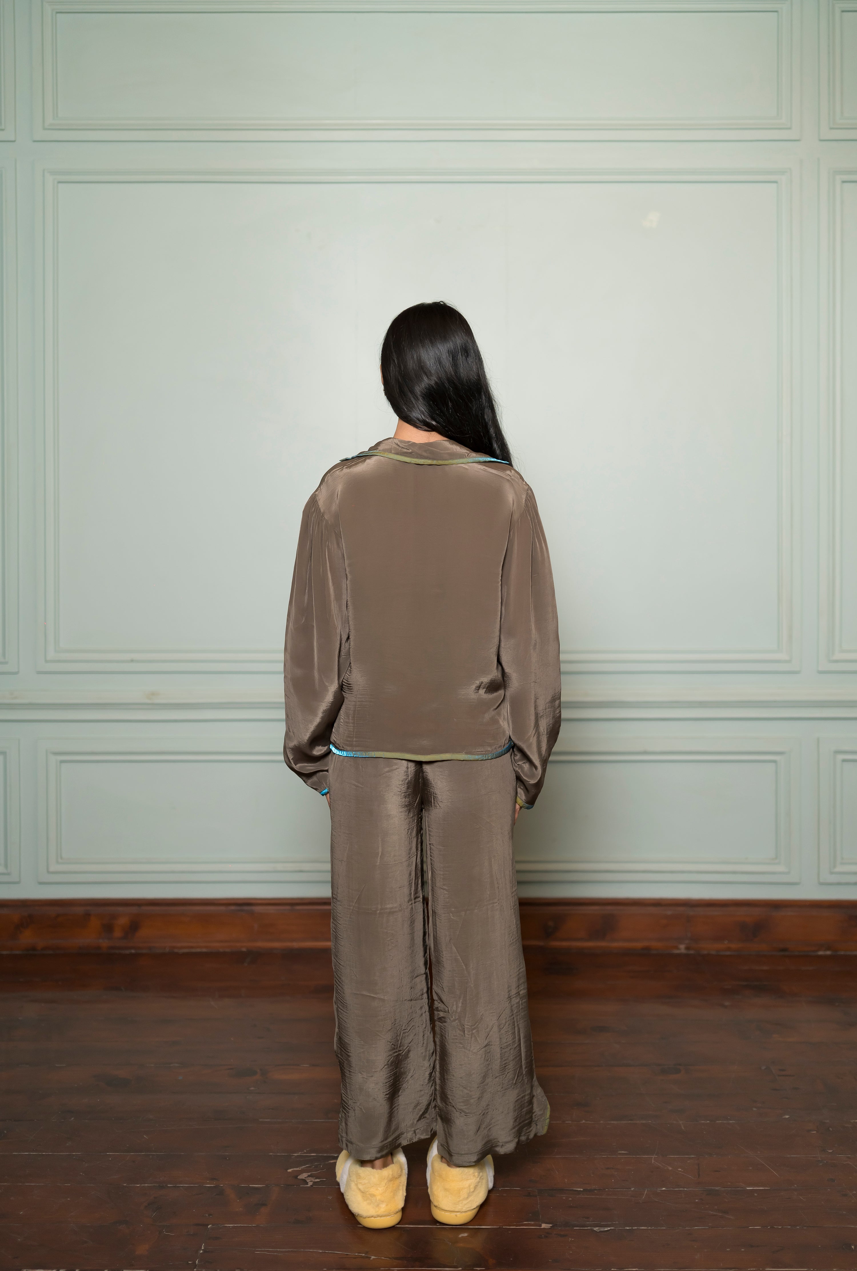 Pant — Straight leg satin trouser; elasticated waist; full length; matching tulip piping at hem