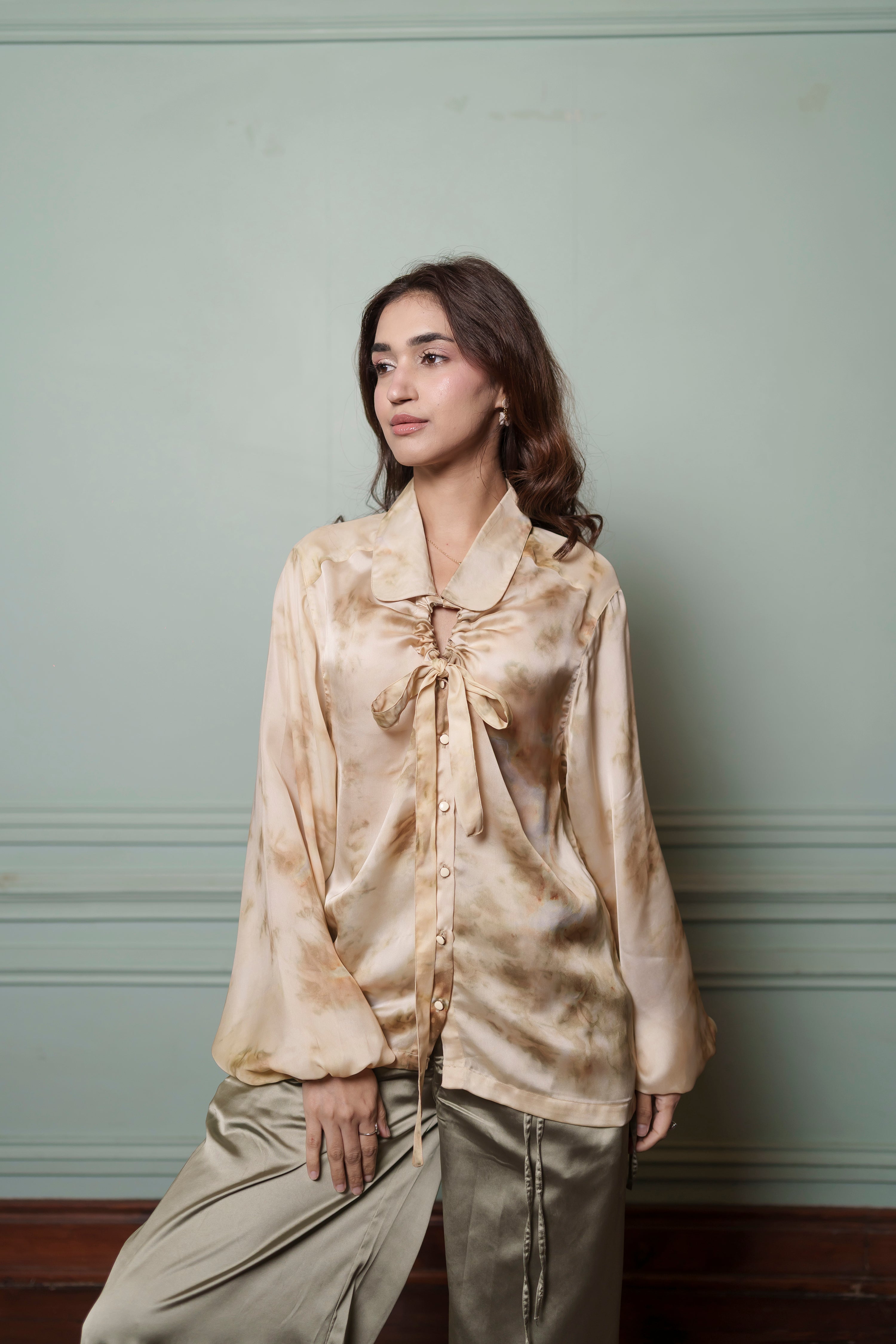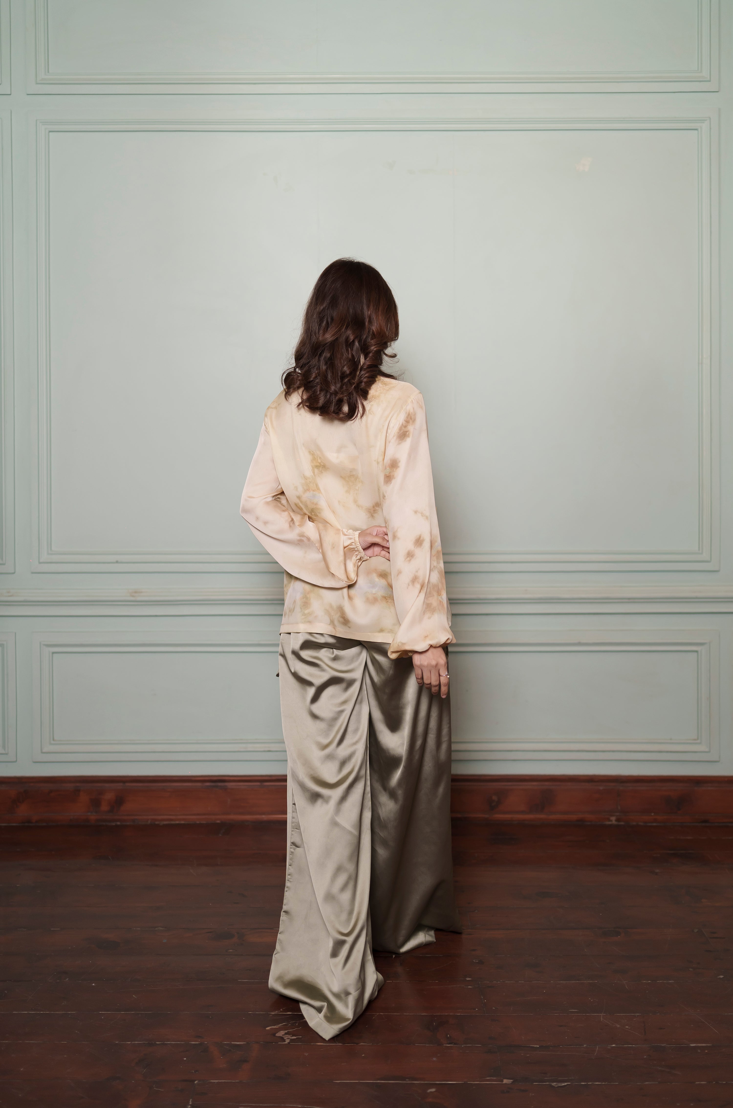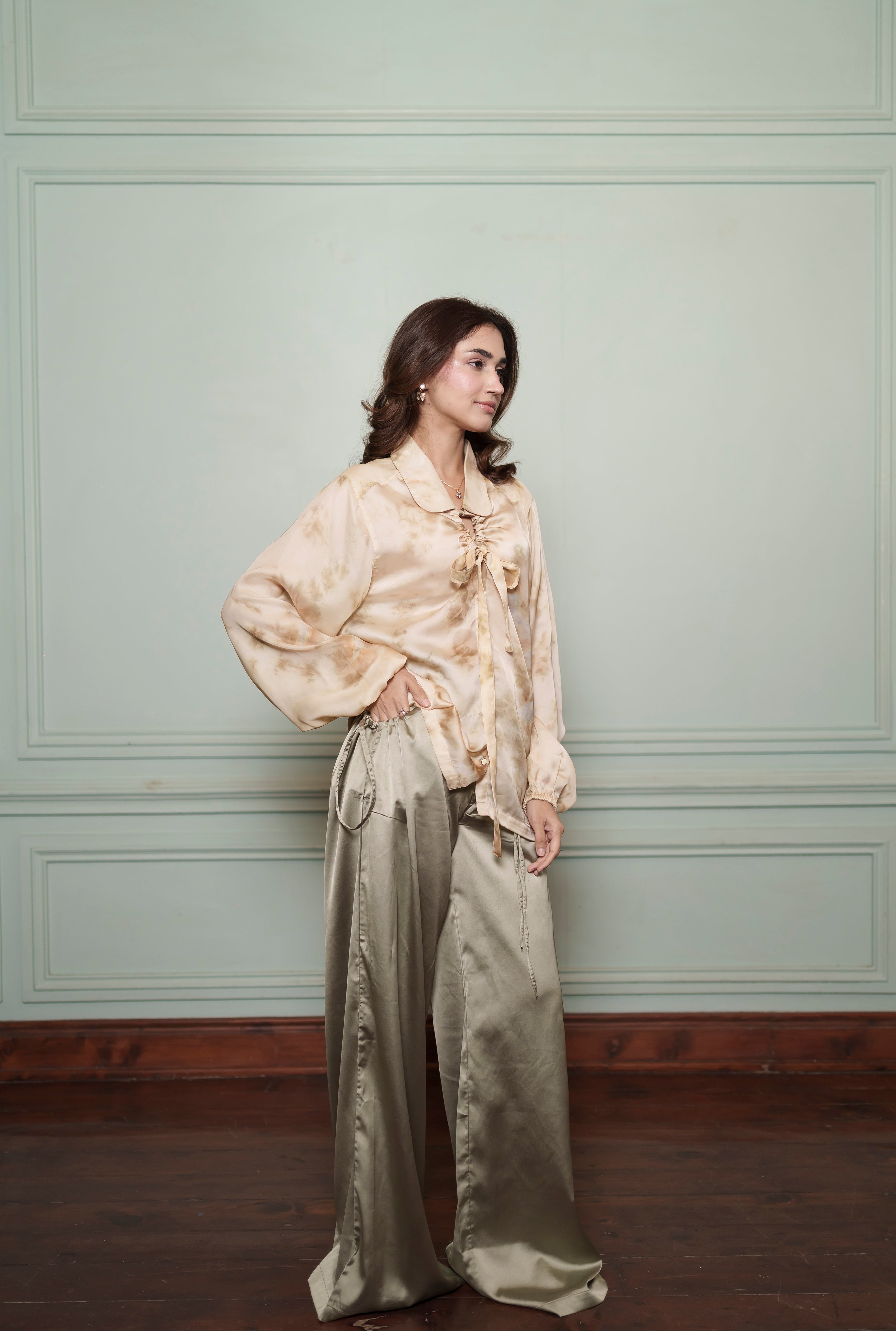 The Sage Mirage Set blurs the boundary between night and day. A marbled keyhole shirt with gathered pockets meets fluid sage satin pants for elegant ease and effortless movement.