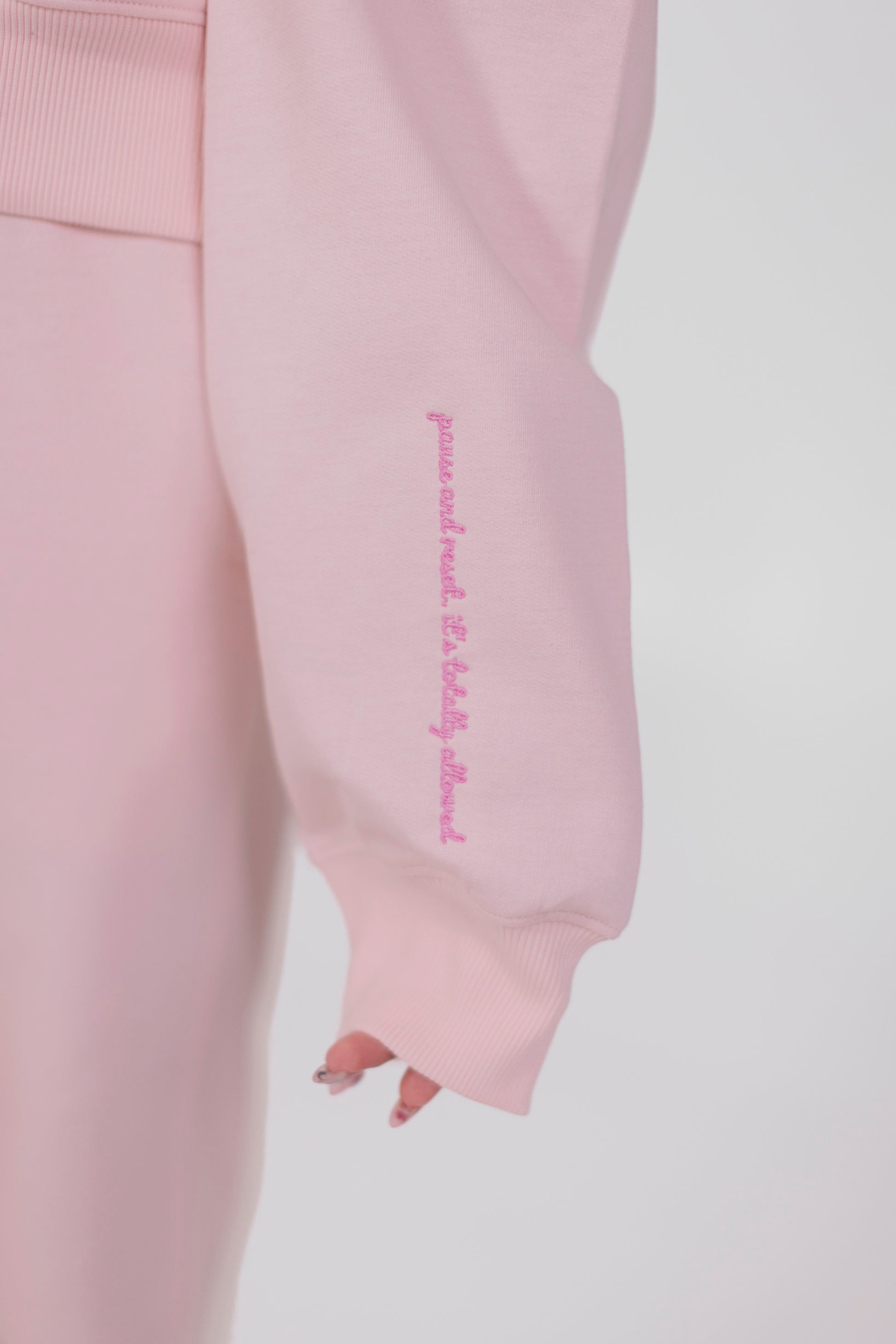 “pause and reset. it's totally allowed” embroidered on the inner left wrist
